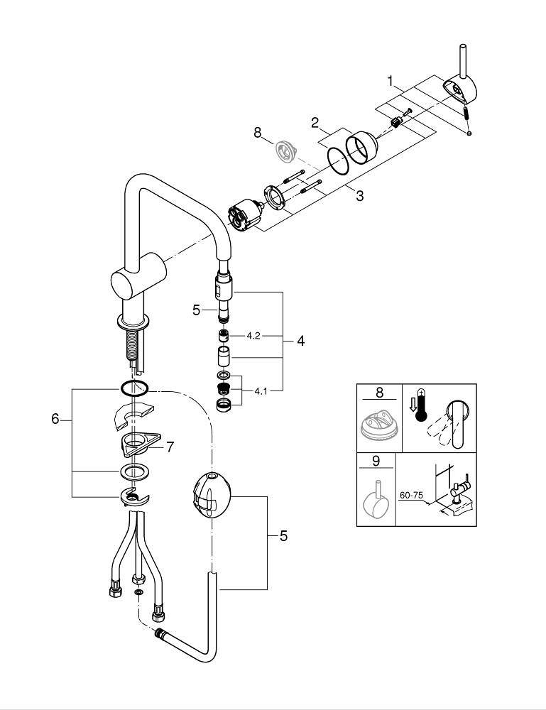 Baterie bucatarie Grohe Minta 3/8'' monocomanda, pipa inalta, tip U, dus extractabil, cartus ceramic, pivotanta, limitator, crom
