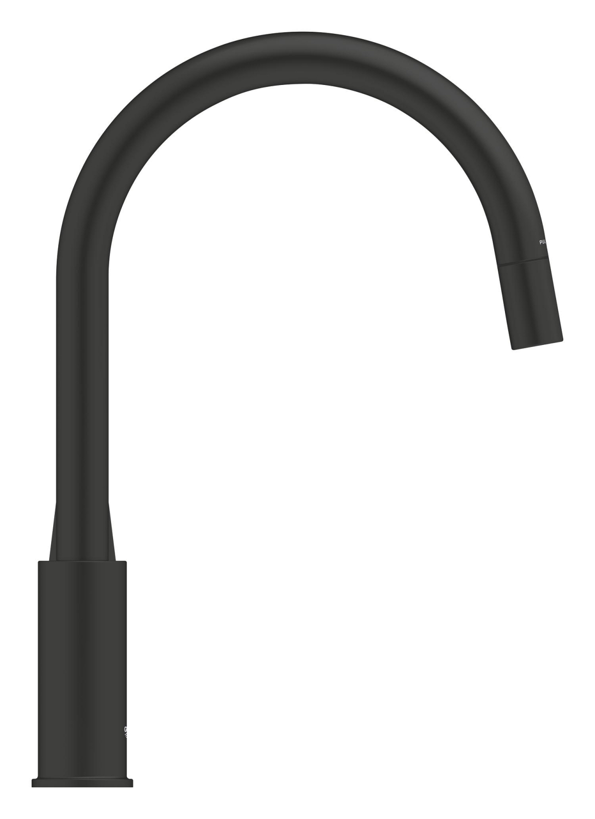 Baterie bucatarie Grohe StartEdge pipa tip C, monocomanda, pipa inalta, tip C, pivotanta, dus extractabil, cartus ceramic, limitator de temperatura, protectie anti-reflux, negru