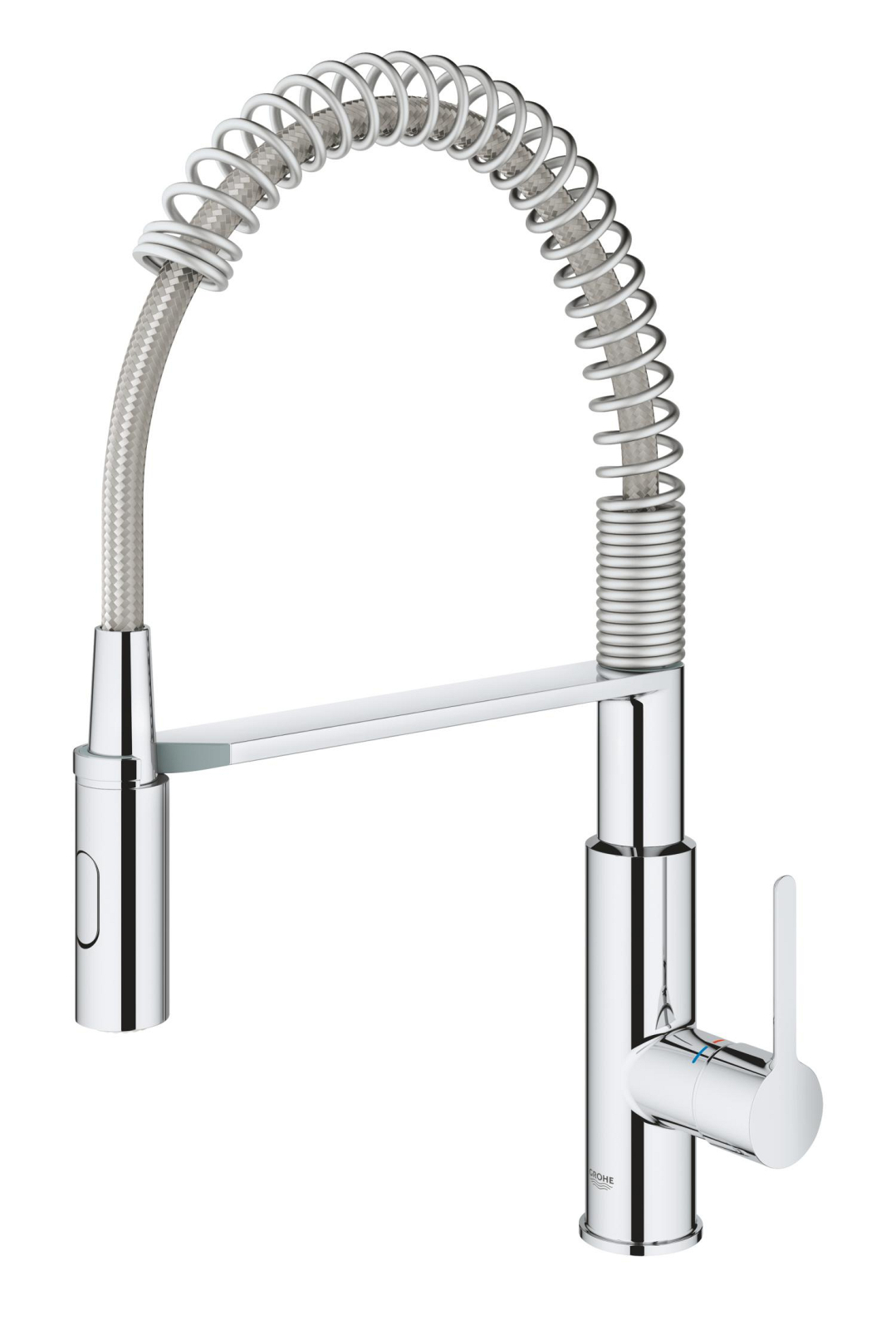 Baterie bucatarie Grohe Via Cosmo dus profesional pipa medie, monocomanda, cartus ceramic, pipa inalta, tip U, dus extractabil, crom