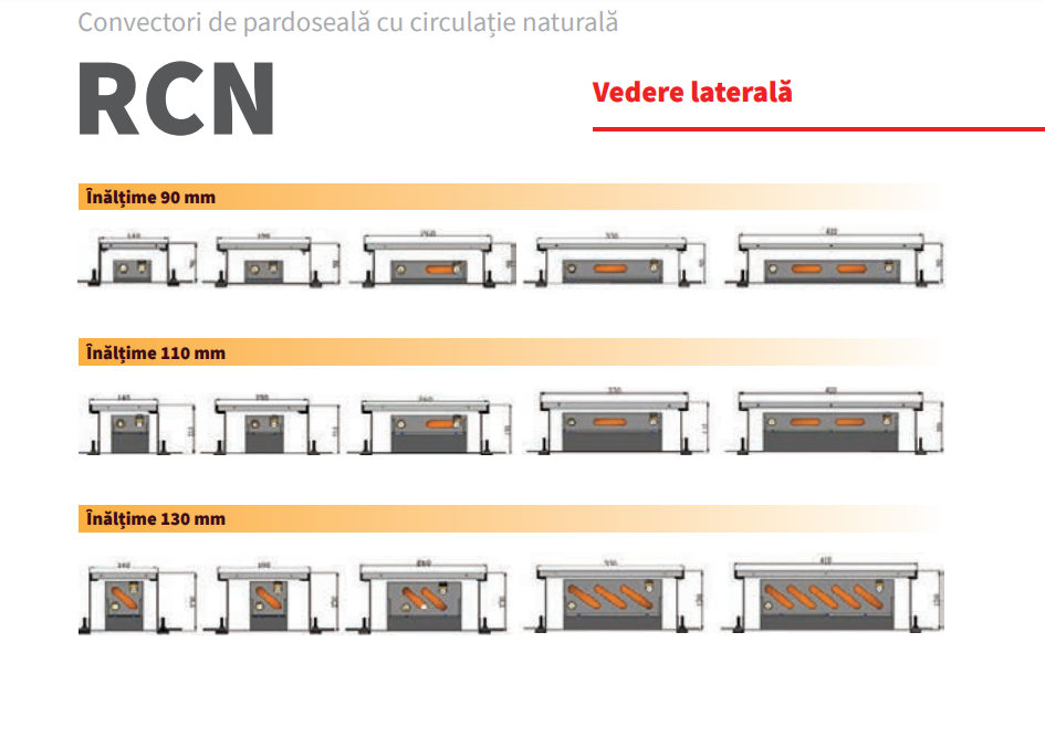 · Convectorii de pardoseală cu convecţie naturală (RCN) sunt echipamente moderne destinate încălzirii aerului şi dezaburirii suprafeţelor vitrate mari în spaţiile de birouri, centre comerciale, showroom-uri,grădini de i arnă, apartamente, etc.