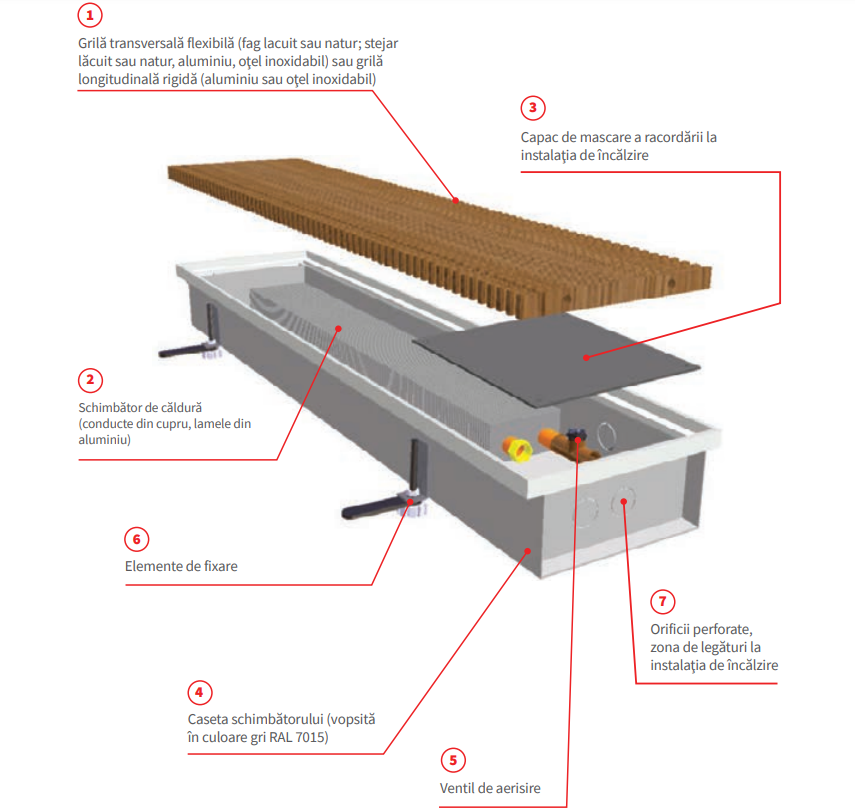 · Convectorul este instalat în pardoseală, iar după construirea pardoselei doar grilele de lemn sau aluminiu, vor rămâne vizibile într-o paletă largă de culori. Este soluţia ideală pentru crearea confortului termic şi pentru amenajările interioare care nu permit instalarea corpurilor de încălzire clasică.