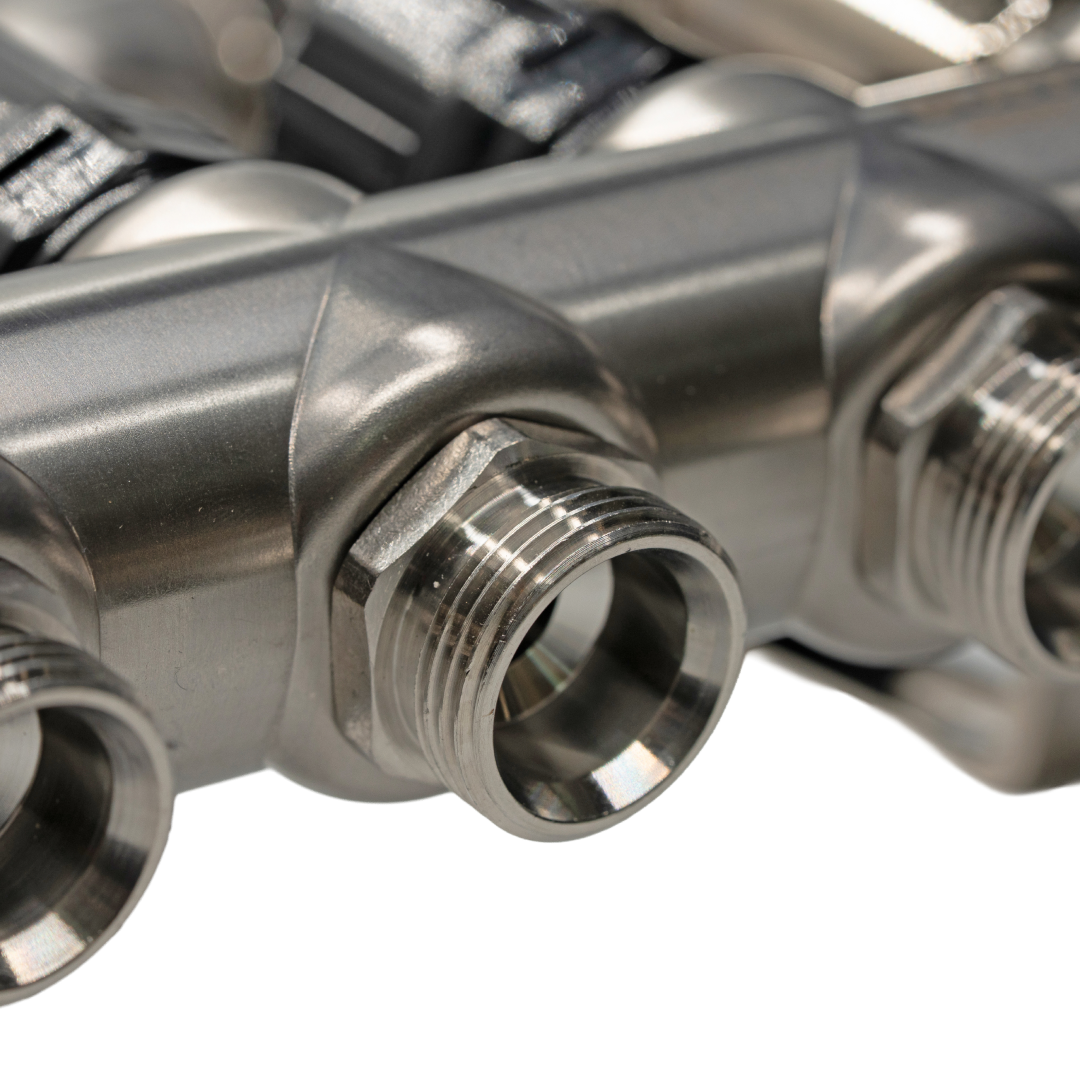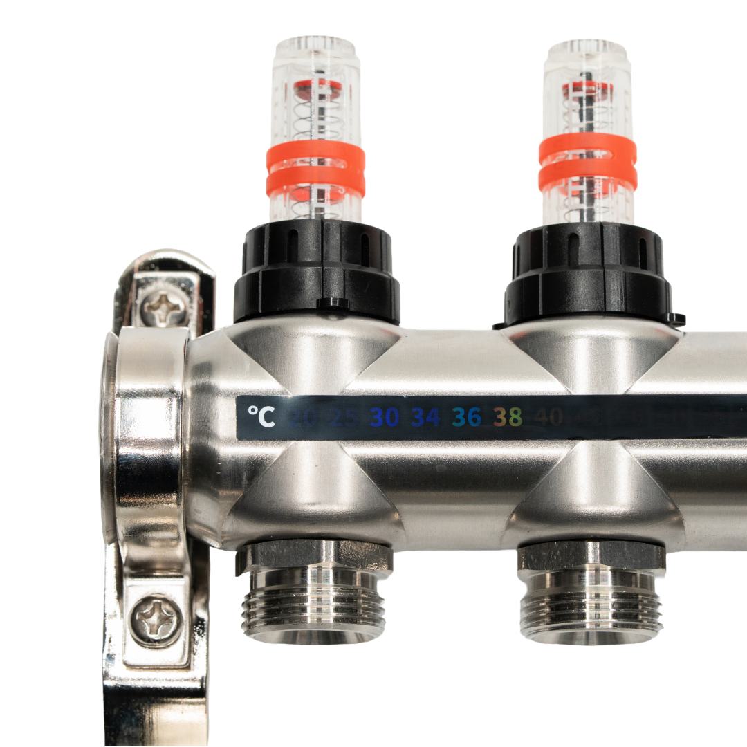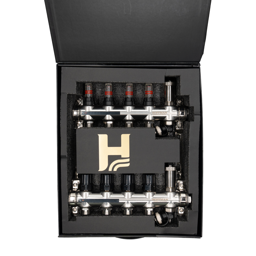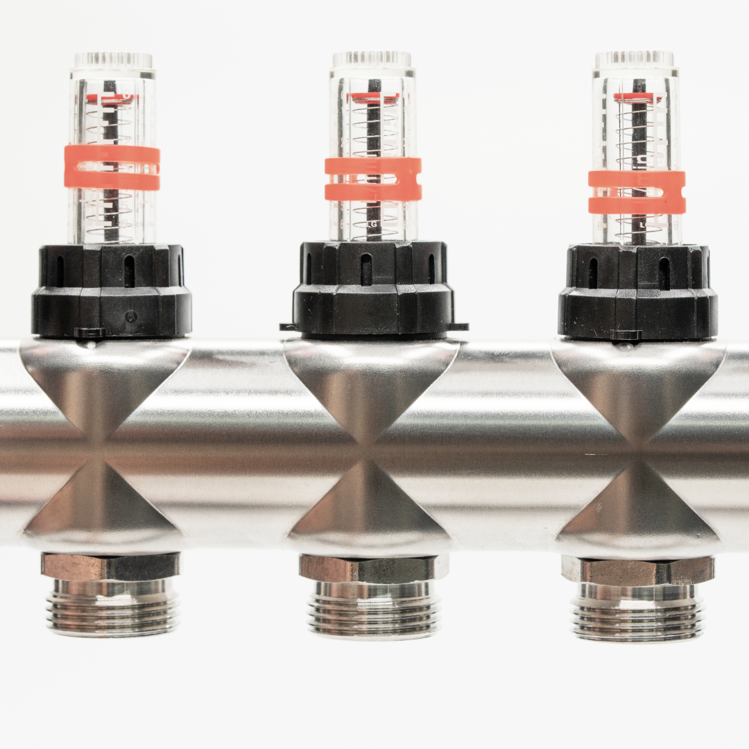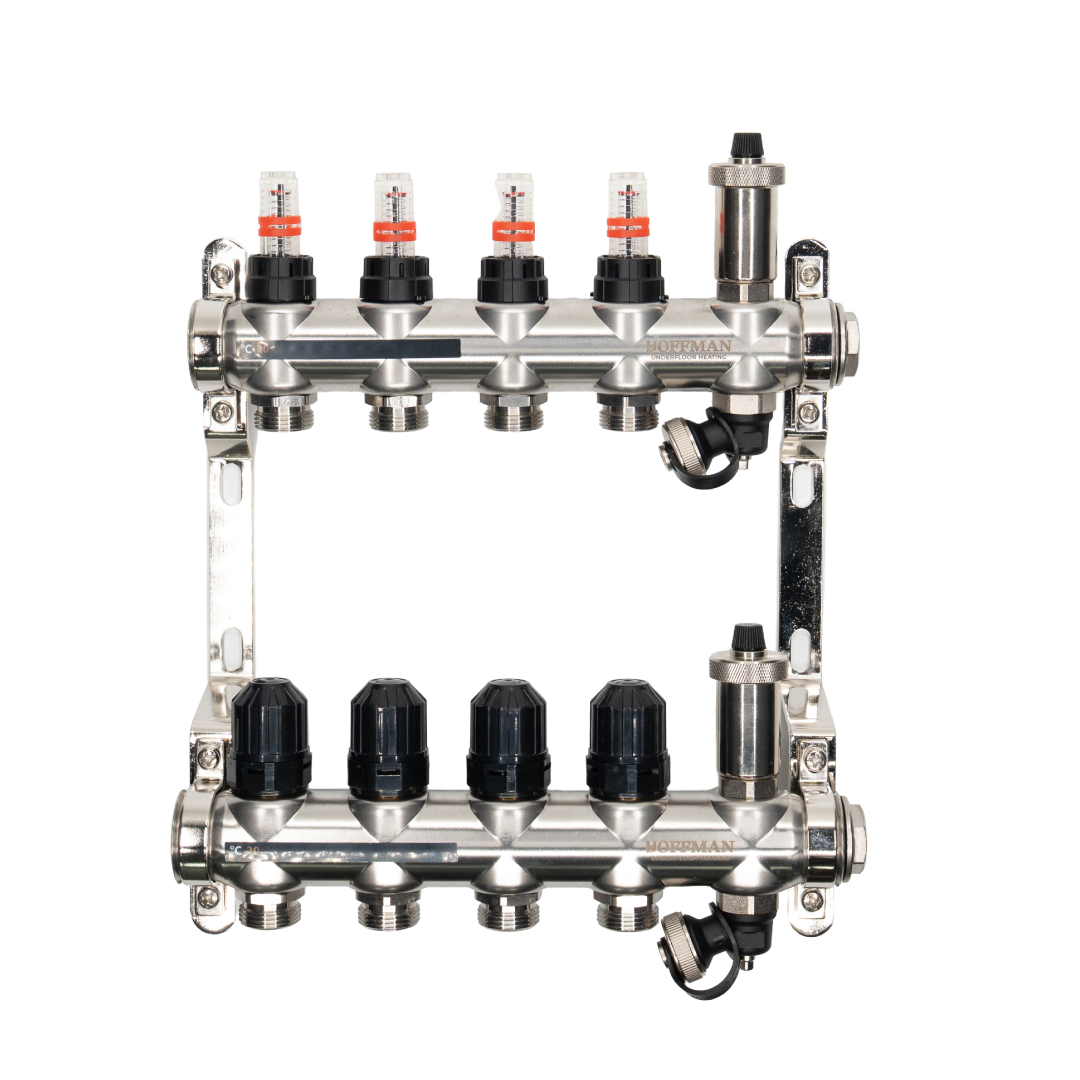 Distribuitor cu debitmetru 4 căi, Hoffman, din inox, oferă echilibrare hidraulică, debit reglat individual, aerisire automată și întreținere facilă pentru sistemele de încălzire în pardoseală.
