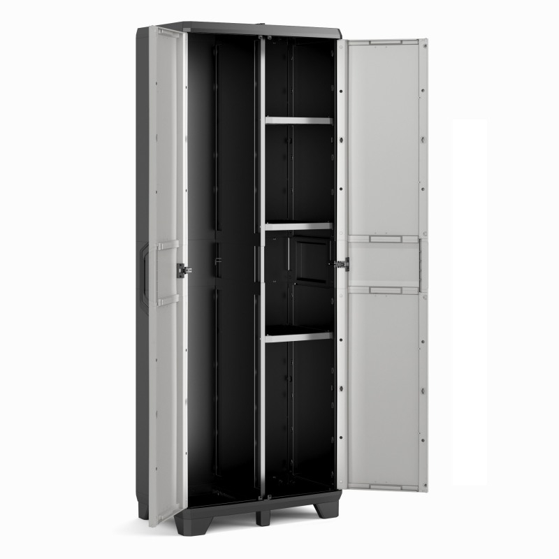 · Dulapul cu 3 polite gri Keter High Gear Utility este impartit in 2 compartimente, partea din stanga se poate folosi pentru depozitarea uneltelor lungi, in timp ce partea din dreapta se poate personaliza cu ajutorul celor 3 rafturi ajustabile care suporta o greutate de 10 Kg fiecare.