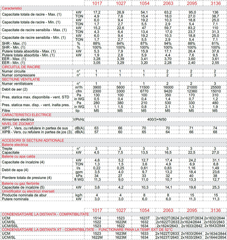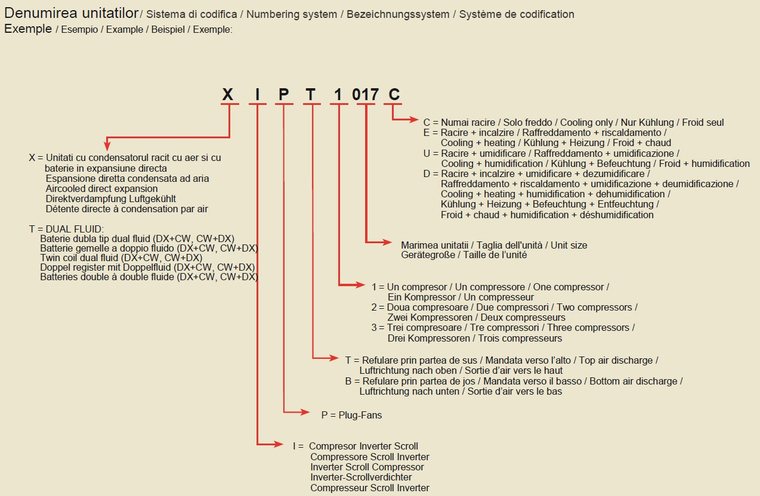 Se disting urmatoarele versiuni: · XIP.../C - doar racire in expansiune directa; · XIP.../E - racire + incalzire cu rezistenta electrica; · XIP.../U - racire + umidificare; · XIP.../D - control automat al temperaturii si umiditatii.