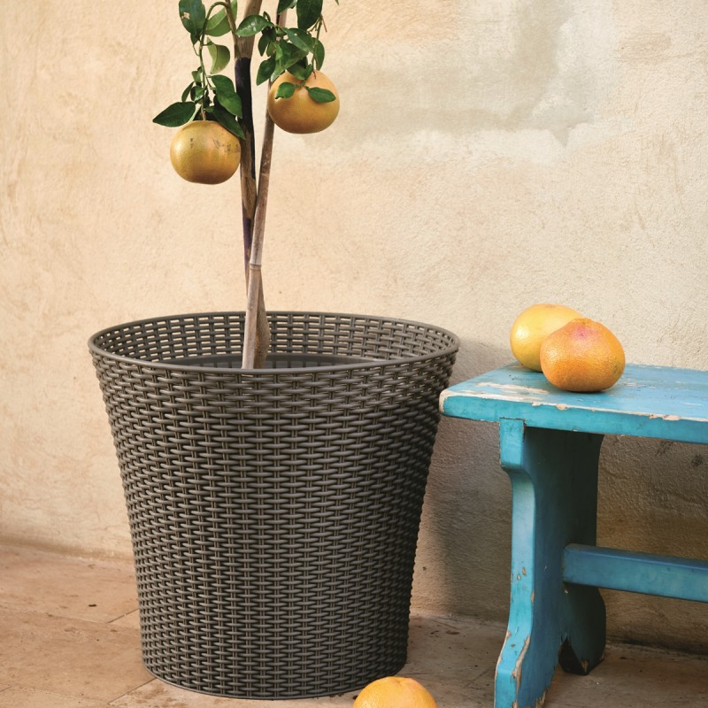 · Ghiveciul maro mocha fara farfurie Keter Conic 57 L cu aspect modern care imita impletitura de ratan este realizat din plastic de inalta calitate si ofera eleganta oricarui spatiu interior sau exterior.