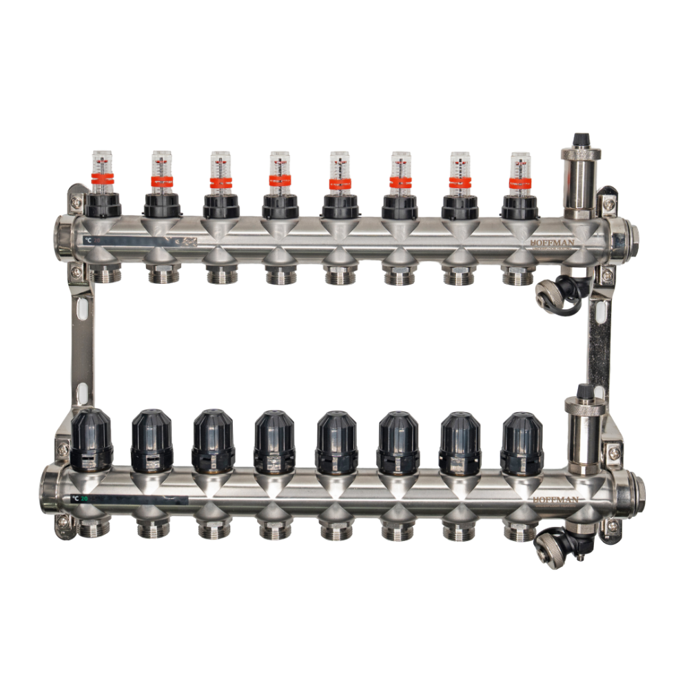 Distribuitor incalzire in pardoseala din inox Innoflow-M 1" x 3/4", 8 circuite, 6 l/min, cu debitmetre si robineti termostatici