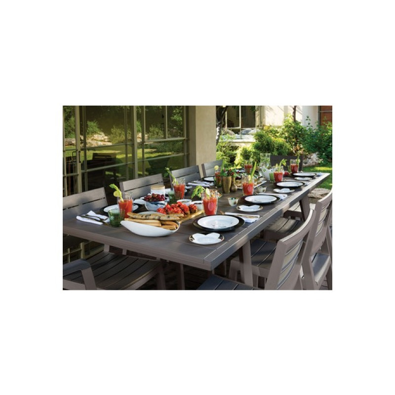 ü Masa extensibila Keter Harmony este o masa de exterior la care pot sta confortabil 10-12 persoane. Este dotata cu un cadru de rezistenta, are un design elegant, care nu se demodeaza, cu o textura asemanatoare cu lemnul natural.