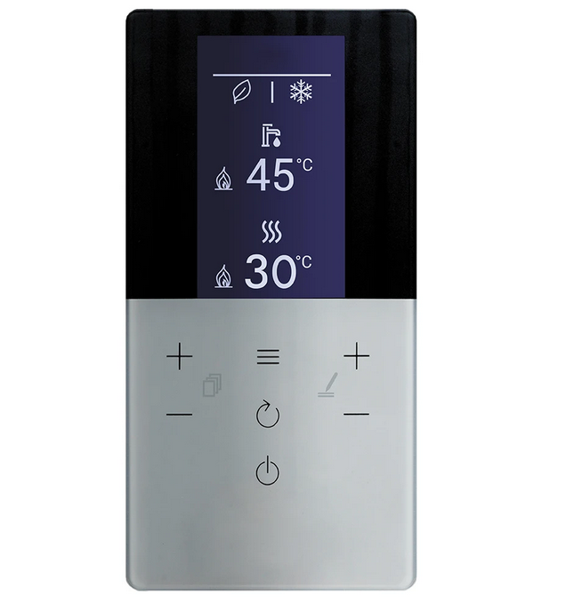 - Schimbător cu plăci apă/gaz, din oțel inoxidabil și brazate, controlat și protejat de sonde de temperatură instalate atât pe partea de apă, cât și pe partea de agent frigorific