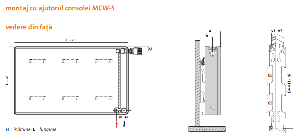 · Accesorii: radiatorul este prevăzut cu 2 console MCW-5, cu dibluri și șuruburi, ventil termostatic încorporat (la dreapta) și ventil de aerisire (la stânga).