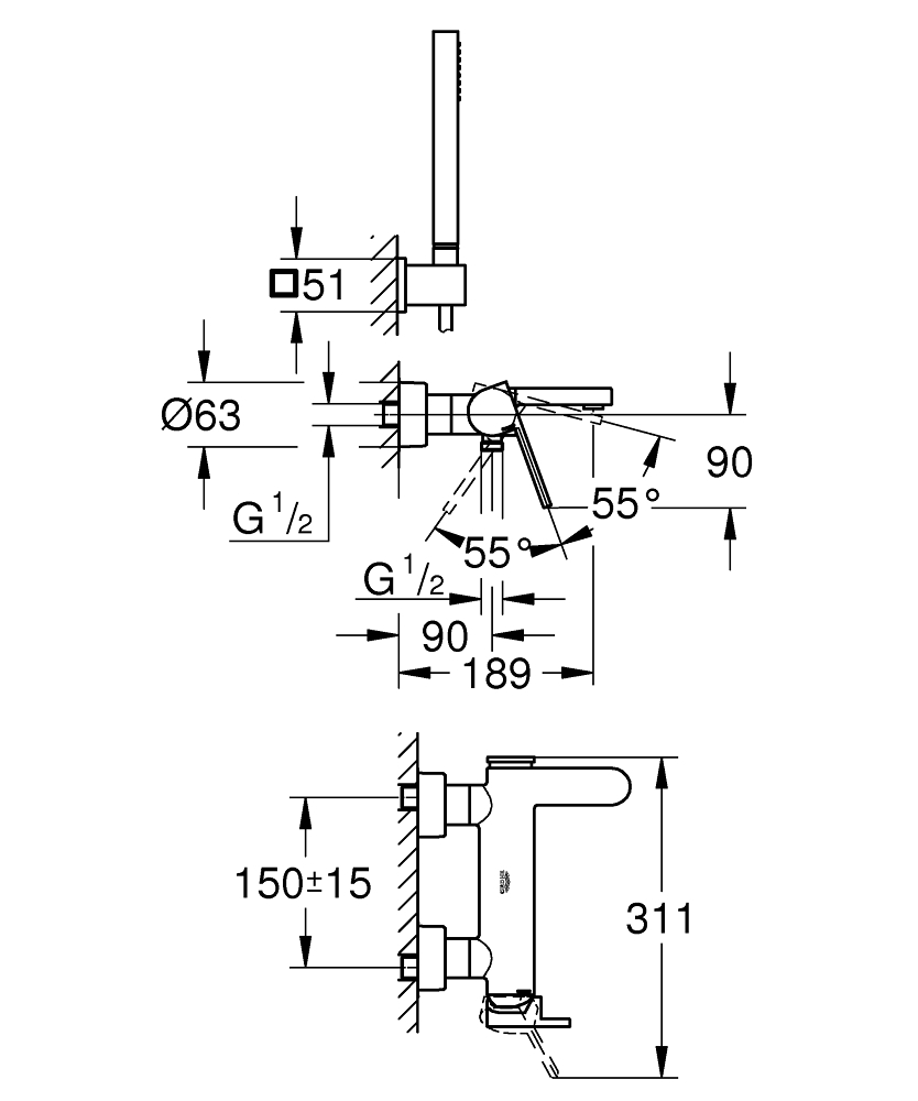 GROHE Set baterie cada si para dus Grohe Plus monocomanda, cartus ceramic, para dus, 1 functie, furtun 1,5 m, suport, crom
