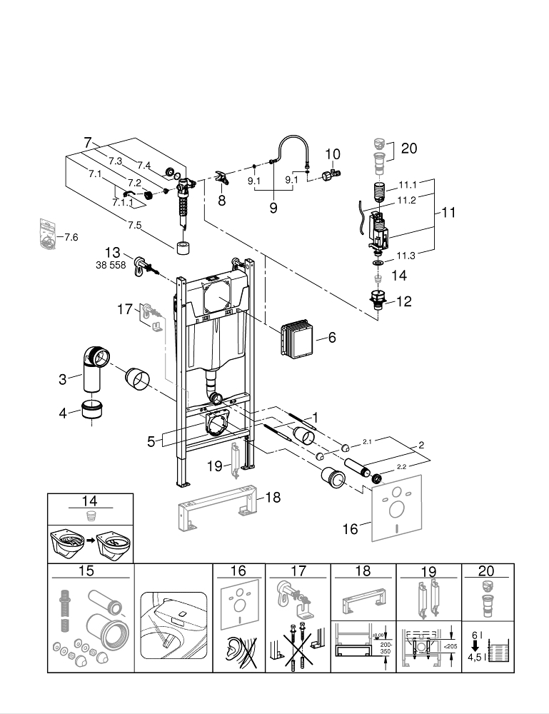 Set 2 in 1 rezervor WC Grohe Solido, WC, 1, 13m, cadru otel, suporti perete, fara placa de actionare