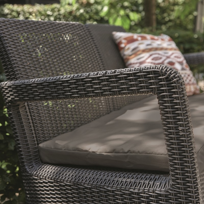 · Set banca 2 locuri si masa gradina graphite Keter Tarifa este fabricat din polipropilena, sub forma unei impletituri ce se aseamana cu ratanul natural, cu suprafata usor rotunjita.