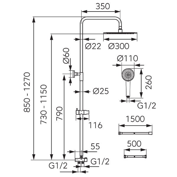 bara metalica culisabila, reglabila pe lungime 850 - 1270 mm