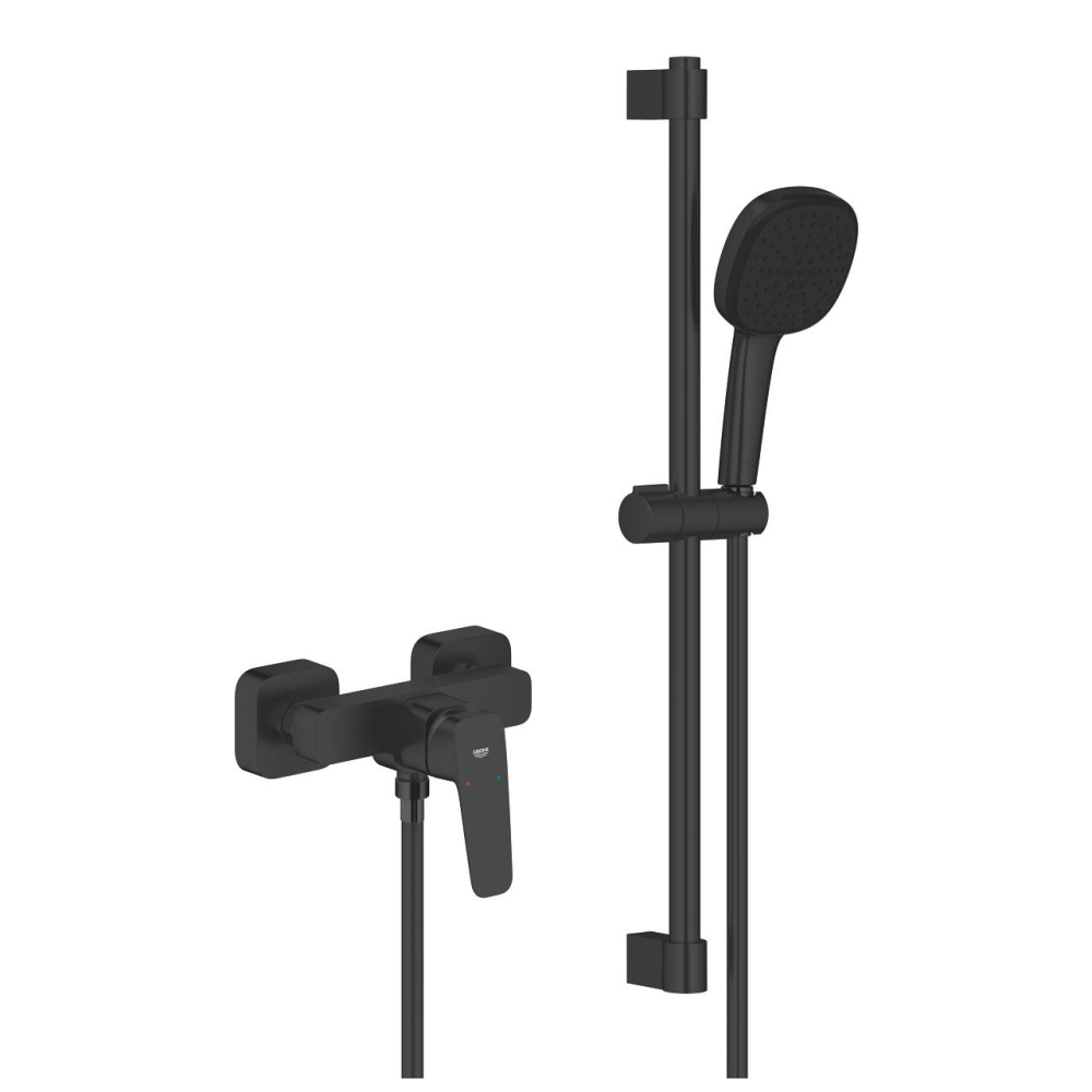 Set de dus Grohe Cubeo SilkMove shw aparenta, monocomanda, cartus ceramic, montare pe perete, coloana de dus, 600 mm, 2 functii, furtun de dus, 1.75m, negru mat