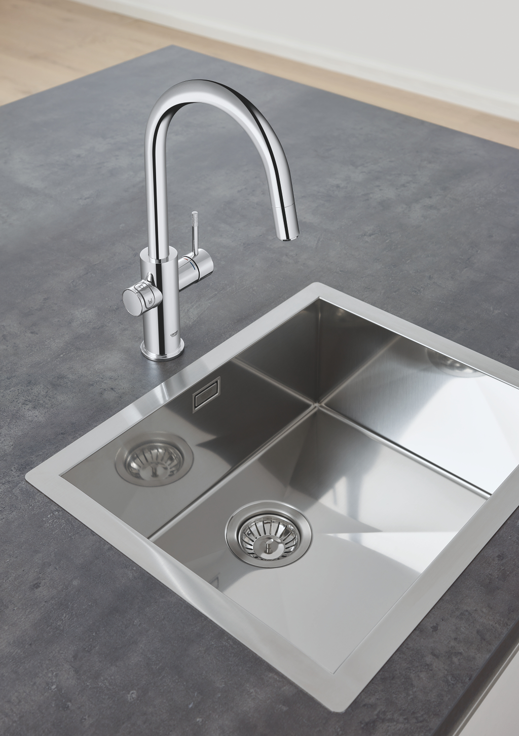 Set filtru cu baterie de bucatarie Grohe Blue Home tip C, pipa inalta, dublu comanda, filtre, racire, apa carbogazoasa, dus extractabil, crom