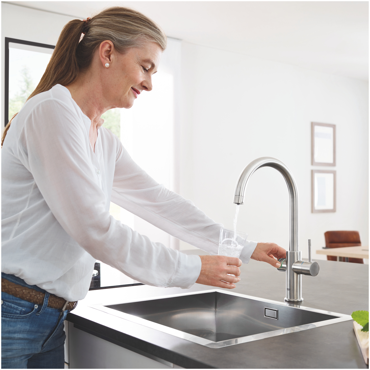 Set filtru cu baterie de bucatarie Grohe Blue Home pipa tip C, monocomanda, pipa inalta, filtare, racire, apa carbogazoasa, pivotanta, limitator, crom mat