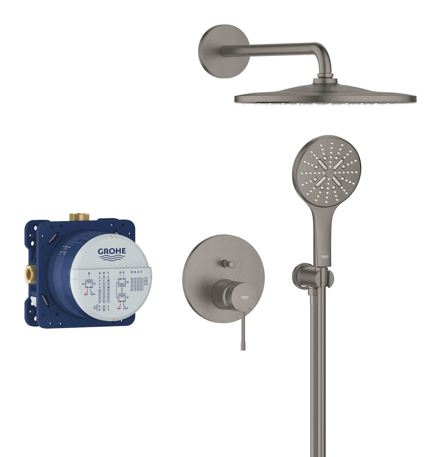 Set sistem de dus Grohe Essence conc 2 functii shw sistem 310, montare pe perete, incastrat, monocomanda, diverter, cartus ceramic, corp instalare inclus, limitator de debit, antracit