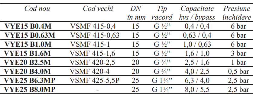 · Notă: - la instalaţiile unde presiunea de închidere/diferenţială depăşeşte valoarea specificată în tabel, se vor monta regulatoare de presiune diferenţială dacă nu sunt echipate cu pompe cu turaţie variabilă