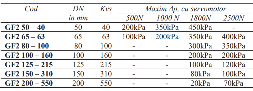 · Dacă presiunea de închidere din instalație este mai mare decât valorile din tabel se vor folosi regulatoare de presiune diferențială, pompe cu turație variabilă sau ventile liniare din seria NTVS.