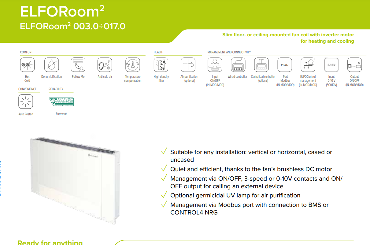 Ventiloconvector tip carcasat vertical / orizontal, 3.01 kW / 2.81 kW, model cu 2 tevi, port Modbus RS485, Clivet Elforoom2